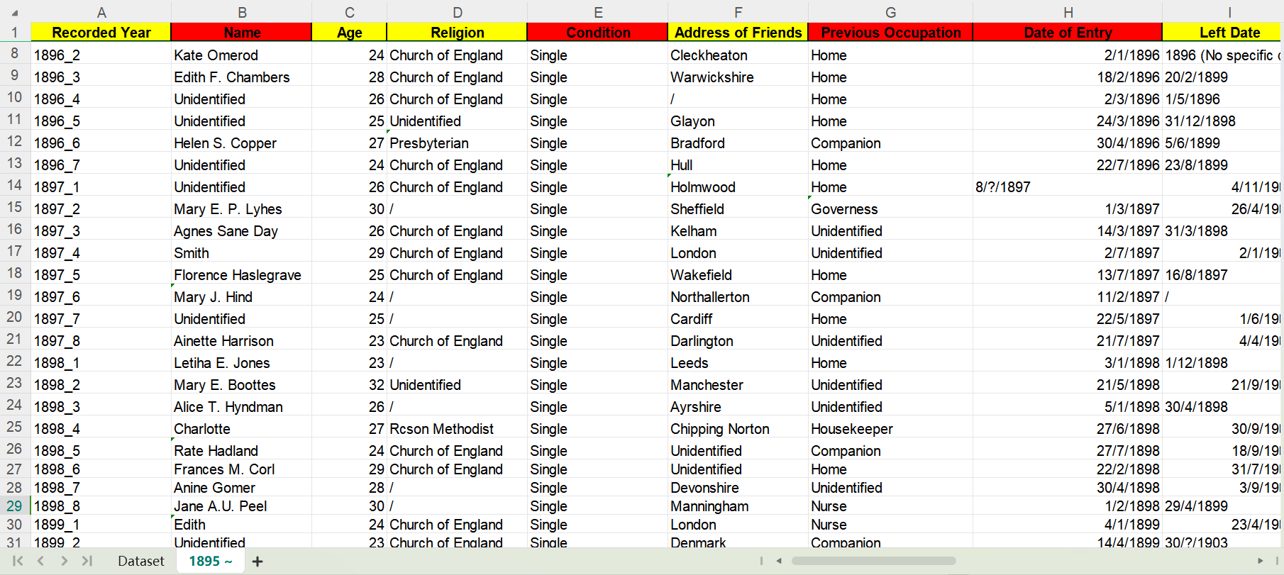 In this section, we explore the truths hidden within the data, supported by both literature and historical records. We utilize the original Nurse Training Register from Leeds General Infirmary during the Victorian British Era (VBE) to examine the foundations of nurse training in the UK. By organizing and analyzing these records, we have identified key patterns and trends that reveal the evolution of training practices and potential inequalities in the field over time.