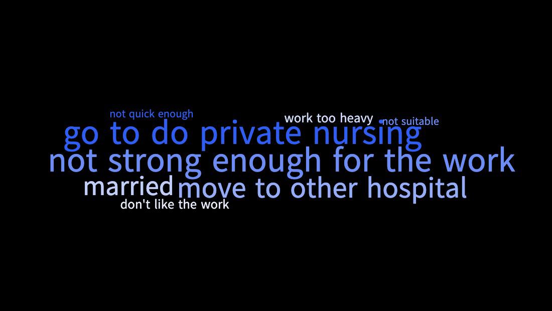As far as the factors that lead students to leave are concerned, personal reasons account for a large proportion, but more detailed information is not available. In addition, failure in course assessment is a very eye-catching factor. This shows that the nurse training and assessment system occupies a more important position than in the past, and is more rigorous and complete.