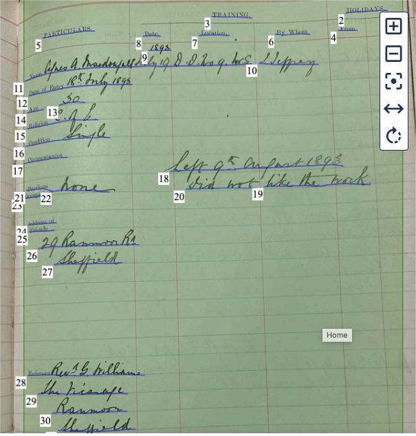 We sourced our historical data from a special collection at the University of Leeds, specifically focusing on a manuscript volume that details the training undertaken by nurse probationers at the Leeds General Infirmary during the Victorian British Era (VBE). This manuscript lists entries chronologically by date of enrollment, with each double-page spread featuring a printed form filled out with key information for each nurse: name, date of entry, age, religion, marital status (condition), circumstances, previous occupation, address of friends, and referees.