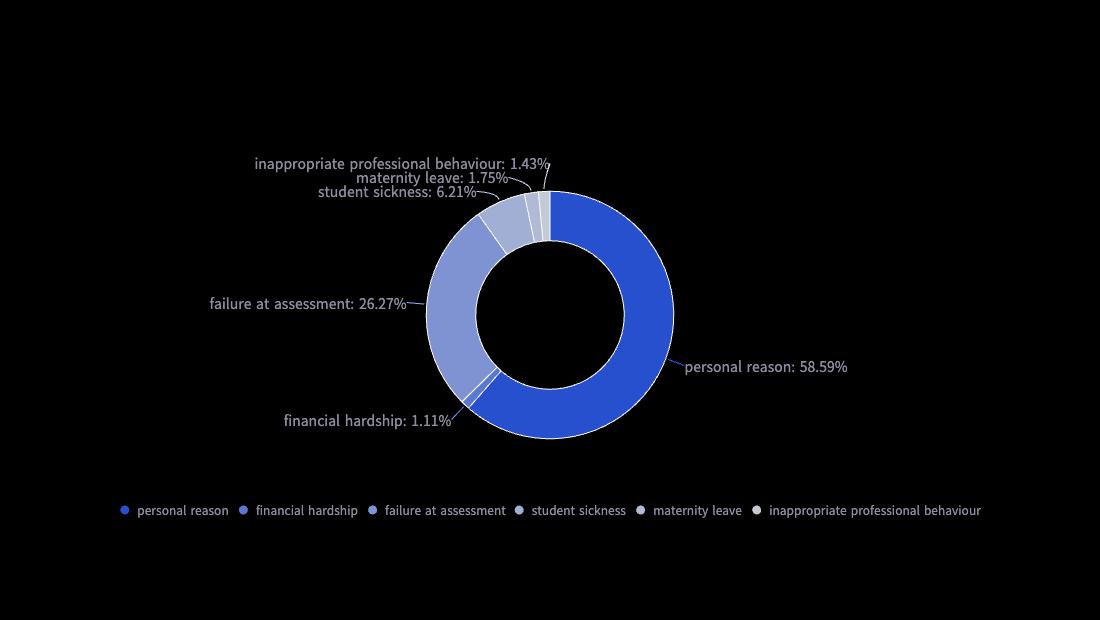 As far as the factors that lead students to leave are concerned, personal reasons account for a large proportion, but more detailed information is not available. In addition, failure in course assessment is a very eye-catching factor. This shows that the nurse training and assessment system occupies a more important position than in the past, and is more rigorous and complete.
