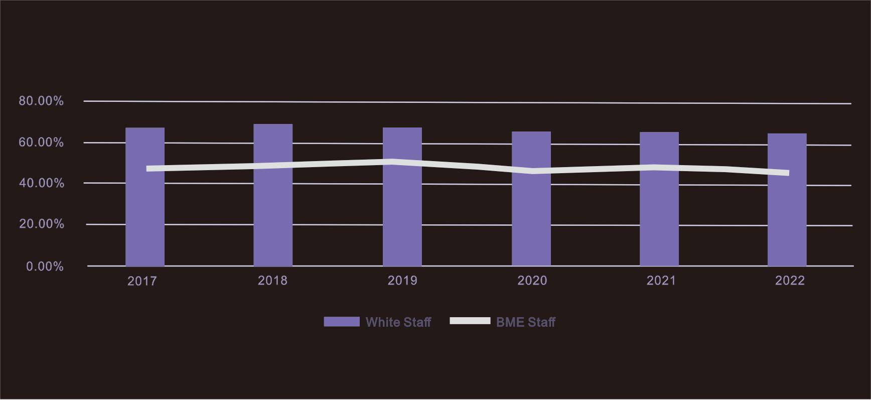 The perception among BME staff starts at a lower point, around 40% in 2017, sees a significant increase in 2018 to nearly match that of White staff, and then stabilizes around 60% for the following years. However, it’s notable that this percentage remains consistently lower than that of White staff throughout the years, indicating a persistent disparity in the perception of equal opportunities for career progression.